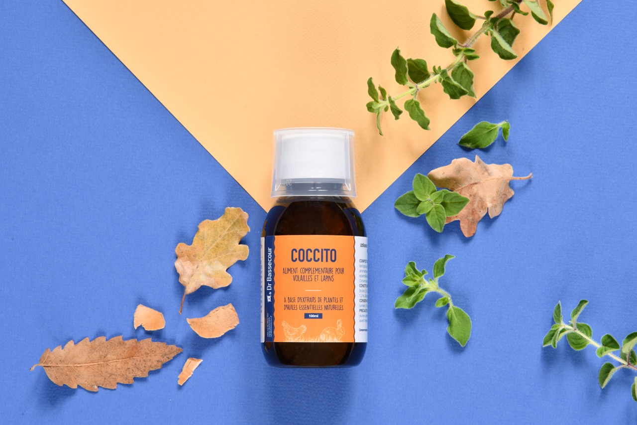 Aliment complémentaire pour volailles, lapins et pigeons à base d’extraits de plantes et d’huiles essentielles naturelles.